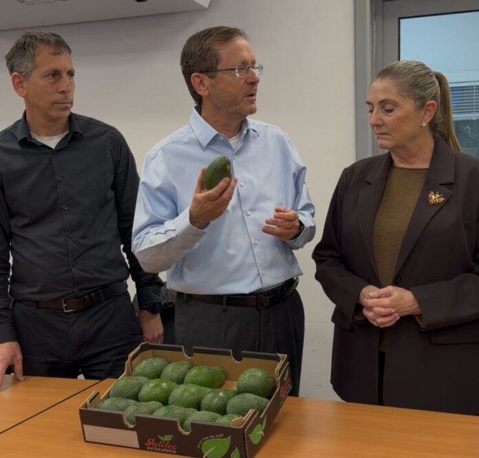 נשיא המדינה יצחק הרצוג ורעייתו מיכל עם ראש מועצה אזורית הגליל העליון אסף לנגלבן- והאבוקדו מהמטע של פושקו ז''ל. צילום: דוברות בית הנשיא